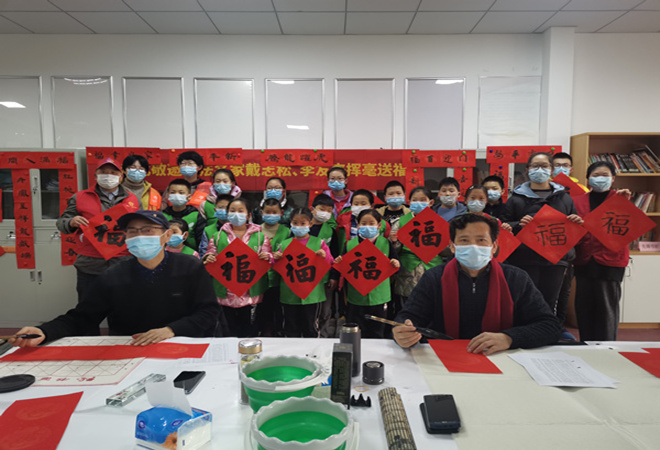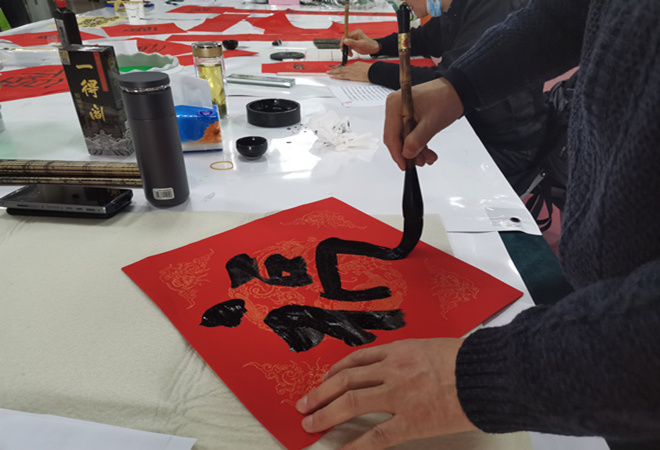 在活动现场,两位老师凝神聚气,提起毛笔挥豪泼墨,一幅幅龙飞凤舞、刚劲有力的书法跃然纸上,老师们把祝福一笔一画融入到书法作品中,红红的春联,浓浓的墨香,提前为春节增添了喜庆的气氛,让大家在墨香中感受到渐行渐近的浓浓年味。现场的老人和孩子们激动万分,跃跃欲试。一边围着老师体验书法的魅力,一边在老师和红管志愿者的引导下,拿起毛笔写起对联和“福”字。老少同乐迎新年,和两位老师一起共同完成了近30副春联和数十张“福”字,春联的美好寓意象征着新年的声声祝福。