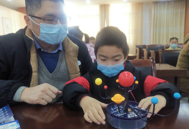 团员志愿者首先概述了中国航天史,详细地向大家介绍了天文小常识。到了实践操作环节,孩子和家长们都迫不及待开始动手制作。完成后,孩子们将组装好的行星仪捧在手中,脸上满是自豪。是为完成制作而自豪,更是为中国航天事业的辉煌成就而自豪,同时航天梦的种子也悄悄播种在孩子们的心田。