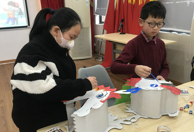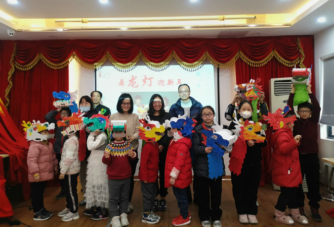 随后,老师还向孩子们讲解了中国新年的来历和各类传统习俗,向孩子们普及了“中国龙”知识,并让家长带着孩子一同制作“新年舞龙头套”。在了解完手工制作的理论知识后,孩子们正式开始了制作活动,在老师和家长的指导下,孩子们都完成得特别认真。硬纸板、水彩笔、彩布等不同材料,在孩子们手中通过剪、折、卷等不同的方式,最终制作出了一条条栩栩如生、活灵活现的“中国舞龙”。
