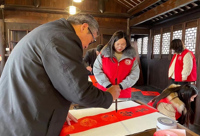 1月25日上午,为喜迎虎年到来,桃源镇文体站、团委在汪宅开展“迎新春送春联”活动。活动现场,墨香四溢,处处洋溢着温暖、祥和的氛围。桃源镇书法家协会的老师们铺好纸张,蘸饱墨汁,手中的毛笔龙腾蛇舞,气韵十足,认真地为每一位居民书写着美好的祝福。