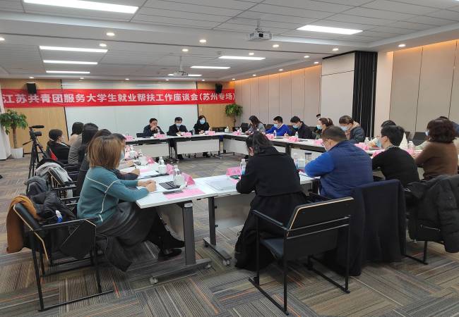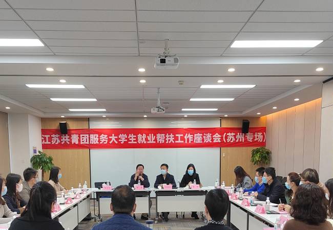 在随后的大学生就业帮扶工作座谈会上,团市委副书记蒋妍就苏州市大学生就业帮扶工作整体情况做介绍。苏州、南通两地部分高校团委负责人以及大学生创业就业典型代表进行交流发言,围绕大学生就业帮扶工作讲现状、谈做法、提问题、给建议。