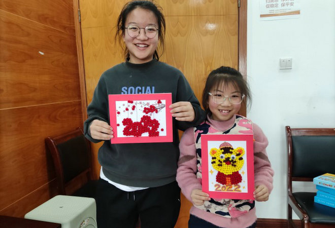 活动前,社区青年团员志愿者志愿者先把准备好的绒花、胶水等摆放好。活动开始后,首先,社区青年团员志愿者为小朋友们介绍了活动的主题并分发材料,让小朋友们选出自己喜欢的图案,接着,社区青年团员志愿者引导小朋友们按照步骤进行创作。经过小朋友们的一番想象后,一粒粒绒花在小朋友们的手里变成了一幅幅美丽的图画,有的贴出一只老虎,有的贴出一串鞭炮。小朋友们充分发挥想象力和创造力,粘贴出了一幅幅美丽的作品,充分展现了青少年活泼的艺术天性。