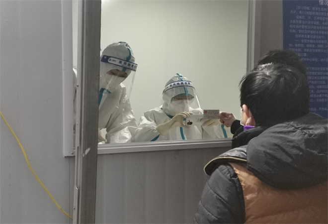 每日上午5点前,所有志愿者们都在各负责点位集中,聆听点位负责人发布任务安排,随后志愿者们开始穿戴防护服、隔离服;6点志愿者们到达各自点位,正式开始核酸检测。参与秩序维护的志愿者在寒风中进行引导指挥工作,维持队伍整齐,人员之间一米线安全距离,保证检测工作的稳步进行;测温、健康码查验志愿者认真仔细查看每一位被采样人员的体温与身份信息,初步排查异常人员;其中8名大学生志愿者站在了与疫情战斗的前线阵地,负责协助医生进行核酸采样信息登记;对于一些行动不便的居民,由社区志愿者带领医护人员上门进行采样登记。