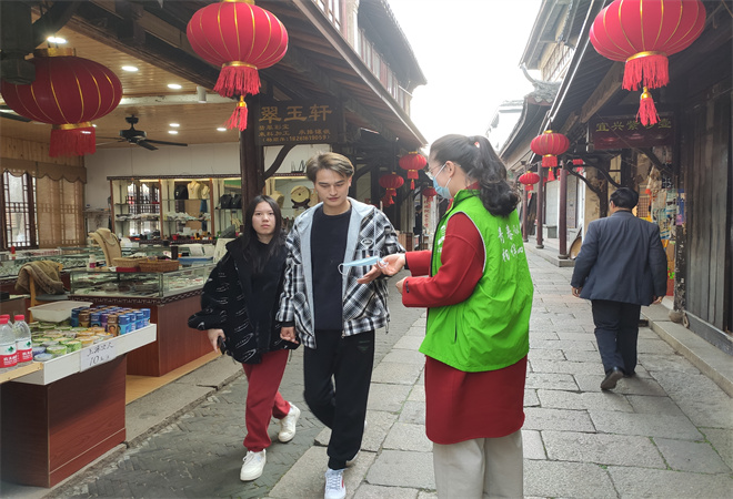 此外,各村(社区)团干部身穿绿色马甲,组成志愿小分队,两人一组分别在古镇入口处、文昌路、长寿路等点位开展志愿服务,提醒来往行人加强日常防护,正确佩戴口罩,并向未佩戴口罩的人员发放口罩。一个个绿色的身影用自己微小的努力共同构筑疫情防控“防火墙”,贡献青春力量。