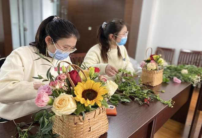 青年团员们早早地来到村委集中,布置好场地,做好插花前的准备工作,修剪花枝等等。活动在9:30准时开始,在活动中,志愿者忙碌的身影在现场穿梭,一会帮这位阿姨拿剪刀,一会帮那位阿姨递鲜花。在志愿者和妇女同胞的同心合力下,一篮篮美丽的鲜花制作完成。活动结束后,青年志愿者又承担起了送花任务,把提前准备好的41束鲜花,送到辖区内妇女信息员的手中,同时把“三八”妇女节的祝福也一并传递到。