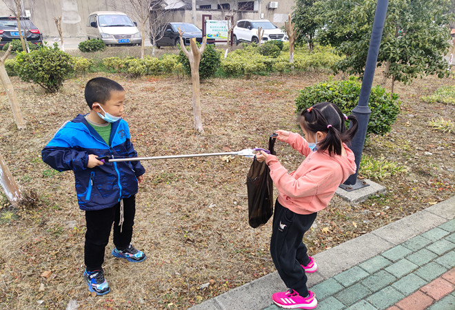 “做做垃圾分类”:最后,前来参加活动的小朋友们一人拿着一个垃圾分类夹,走进周边的村庄进行“环境大扫除”。有的年纪稍小的小朋友分工合作,一个拿袋子,一个捡垃圾,配合默契。