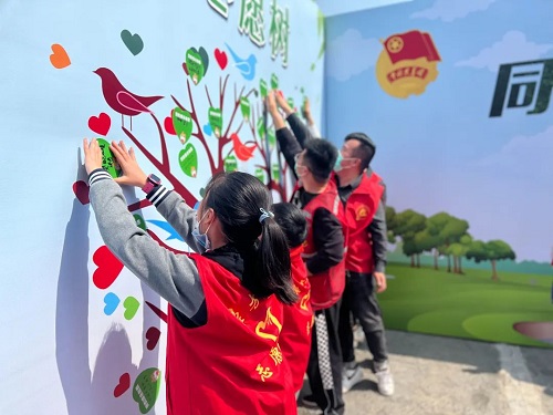 青年志愿者亲手写下愿望,深情祝福家乡和祖国越来越美。
