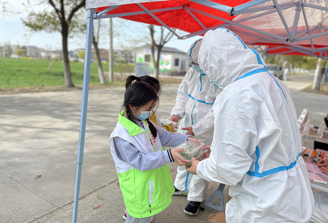开始前,先取适量糯米粉放入盆中,边搅动边加入青汁,直至凝结成团,再用手揉搓形成表面稍干的面团。制作过程中,青年志愿者们分工合作,一人将豆沙分成一个个大小适中的小块,并揉搓成球。其他人负责包制,揪一块糯米粉面团,在手中反复搓圆,用大拇指在中间窝个洞,然后将馅料放进去,收口,一个完整的青团就做好了。小朋友们也家长的耐心指导下,边看边学,从手足无措到逐渐熟练,制作出一个个可爱的小青团。很快,青团经过了十五分钟的蒸制,香气四溢,十分惹人,大家迫不及待地把装团包装好,送到了执勤“大白”的手中。