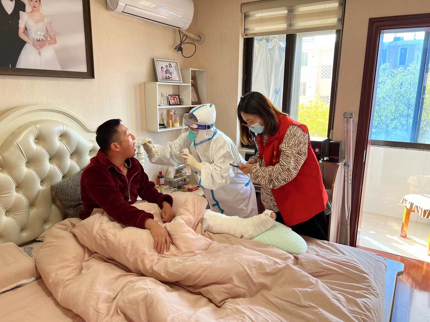 “你好,我来给你们做核酸采样了,不要紧张……”张家港市金港街道海港社区青年志愿者带领巫山卫生服务中心的医务人员对居家隔离人员进行核酸检测。