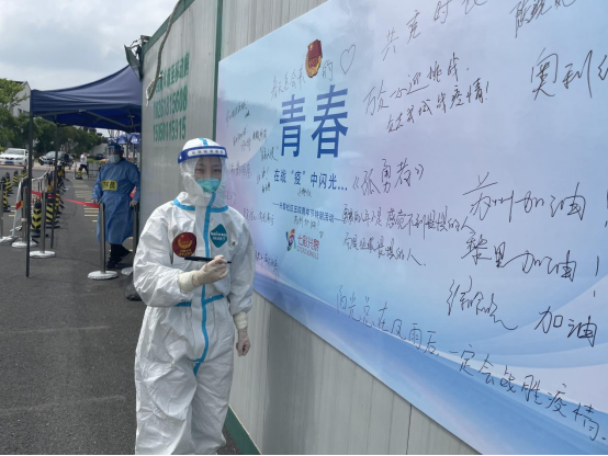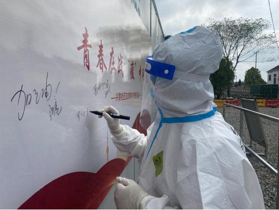 为致敬这批美丽的“逆行者”,黎里古保办协同社区为每一位坚守在点位上的志愿者送上一束鲜花。“辛苦了!”“感谢你们的无私奉献。”核酸检测点依然忙碌,但一句句暖心的话语,一朵朵美丽的鲜花和最美的人在一起,便构成了别样温馨的风景。同时在每一个点位上设立一块心愿板,邀请点位的青年志愿者们将自己的祝愿写在纸板上。“苏州加油!黎里加油!”“春天虽会迟到,到一定会到来!”“阳光总在风雨后,一定会战胜疫情!”“携手抗疫,黎里有我!”……一字一句都包含了青年对战胜疫情的信心和决心。党有号召,团有行动,疫情就是命令,行动方显担当。活动的最后,青年志愿者们将“‘青’力而为,黎里有我”的铮铮誓言记录在镜头中,铭记在内心,落实在行动,将青春的风采、团魂的力量闪耀在战“疫”一线。
