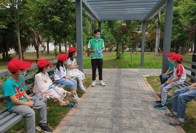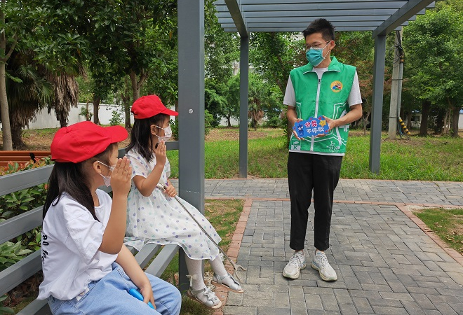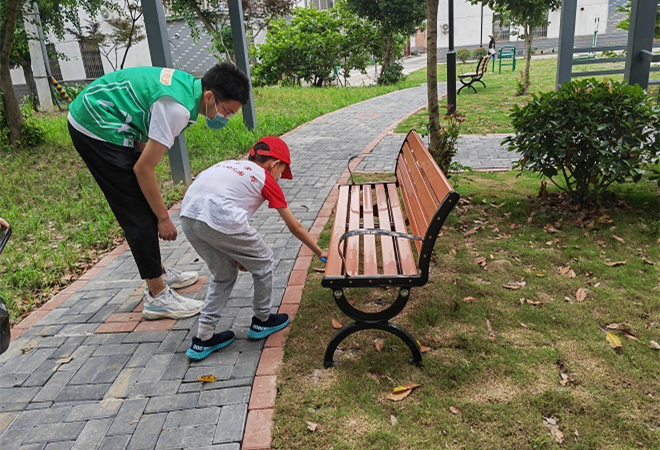 活动分为两个部分,垃圾分类知识小课堂以及垃圾分类实践体验行动。小朋友们聚坐在亭子里,团员作为小蜜蜂宣讲员向各位小朋友普及垃圾分类的相关知识,且采取问答的形式,调动小朋友们参加活动的积极性;知识学习后,又组织小朋友们,在家长的陪同下,在小区旁的公园里捡垃圾,分类装到不同的袋子里,通过实践操作加深小朋友们对垃圾分类知识的理解。
