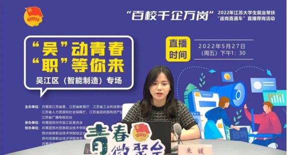 为聚焦青年就业创业需求,不断提升服务大学生就业创业和招引青年人才留吴发展工作实效。今天(5月27日)下午,吴江团区委联合苏州信息职业技术学院、吴江经济技术开发区团工委举办 “‘吴’动青春,‘职’等你来” 吴江区 (智能制造) 专场直播荐岗活动。