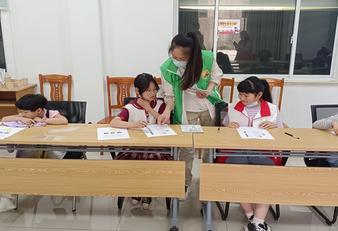 志愿者们巧手翻飞,大家一边互相交流,一边包粽子,一只只三角形的粽子就成型了。同时,青年志愿者带领小朋友们一起进行趣味闯关游戏,通过端午知识、解密、垃圾分类、两人三足等小游戏让小朋友在游戏中学习知识、在参与中获得快乐,现场笑声不断,洋溢着欢乐的气氛。