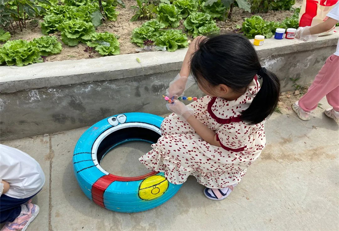 小朋友们在团总支志愿者的带领下一起在轮胎上画画,绘制出五颜六色、充满童趣的图案,作为菜地挡板使用,小朋友们冒着炙热的阳光,挥洒着汗水,坚持挥动手中的“画笔”,为美丽菜园增添一分色彩,“绣”出美丽乡村新画卷。