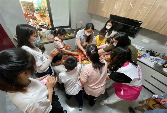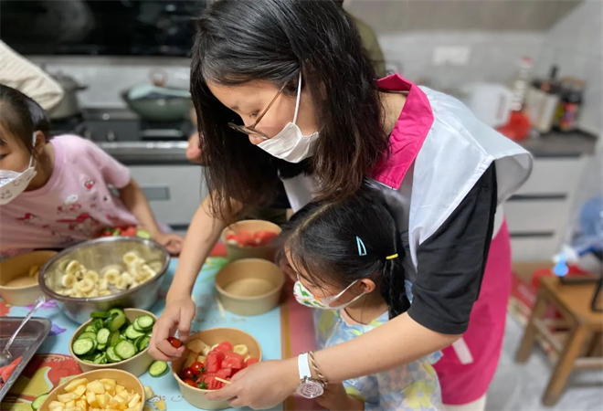 小朋友们认真作画,大人们也没闲着,帮我们的小朋友们制作水果沙拉,洗水果的洗水果,剥皮的剥皮,切水果的切水果,分工明确,忙的不亦乐乎,食材准备完毕,孩子们将自己喜欢的水果放入碗里再挤上沙拉酱,这样酸甜可口的水果沙拉就做好啦。