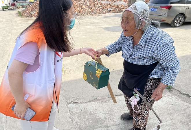 活动现场,经验丰富的村民向青年们传授前期糯米、粽叶等相关材料的准备方法和技巧,并展示包粽子基本手法。“巧手”们积极示范,“新手”们认真学习。在村民的帮助下,青年们逐渐学会了拿捏粽叶的手法和捆绑稻草绳的方法,不一会儿功夫,一个个有模有样的粽子在大家手中初见雏形。随后,团员将粽子装到了精美的包装里,并与村工作人员一同将包好的粽子送给了辖区内的低保户及九十岁以上老人,让他们一同感受节日的氛围,给他们带去温暖。