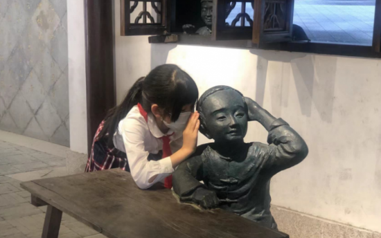 “2017年,学校建立时就把简晓峰校长与‘年年老板’的故事以雕塑的形式呈现出来,就是希望让孩子们能够学习小开甲的精神,发奋读书,在他们十岁时也立下远大志向。”吴江区程开甲小学副校长周菊芳介绍,每年学校都会为三年级的孩子举办成长礼活动,这是“悟先生”中的一个重要活动,让十岁的孩子们跨越时空和十岁的小开甲相遇,也遇见更好的自己,今年也不例外。