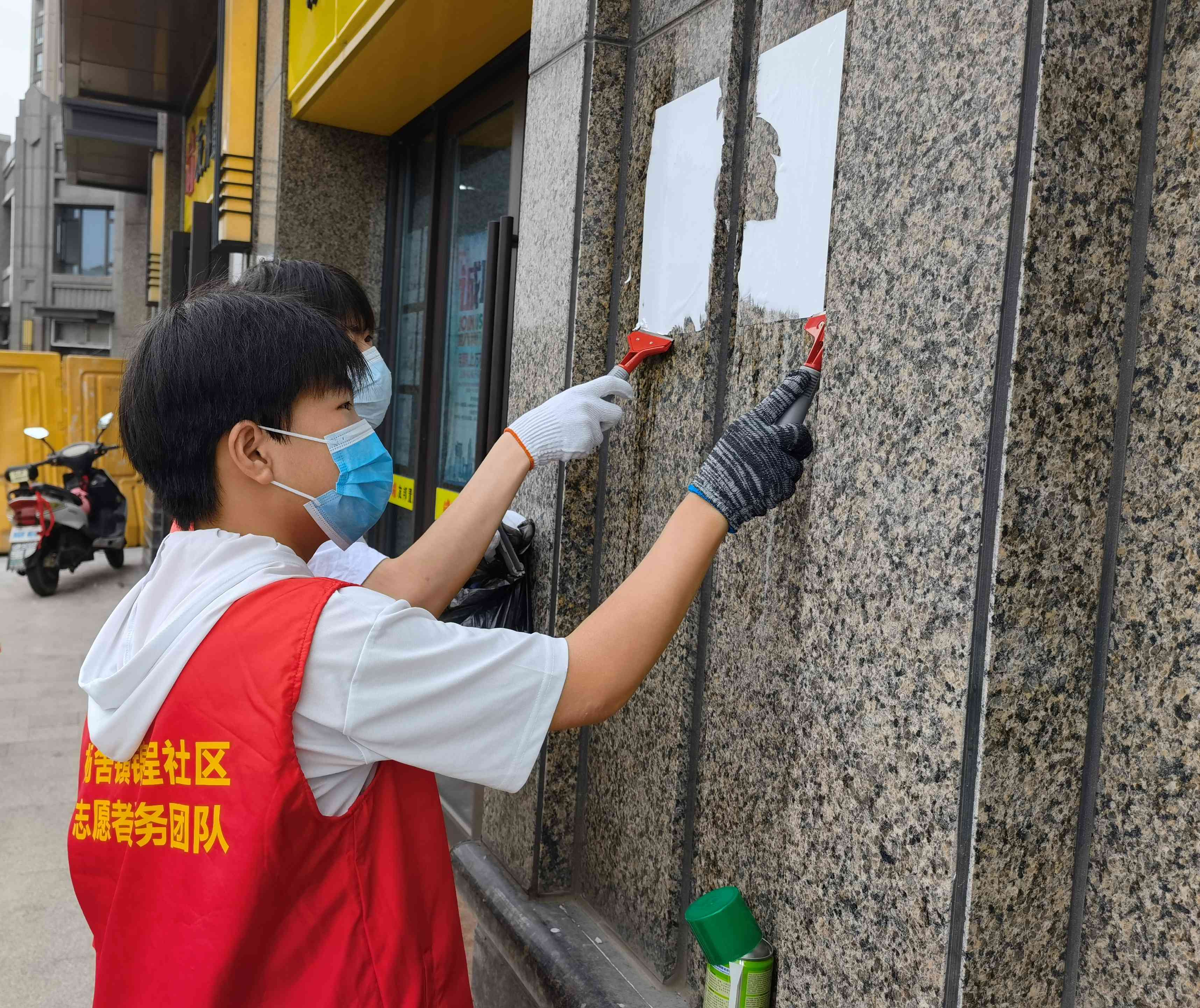 虽然天气炎热,但丝毫阻挡不了志愿者们服务热情。活动现场,青少年们对小区周边门店张贴的已经过期了的疫情防控宣传贴纸进行清理:撕广告纸、喷除胶剂、铲广告背胶,大家分工合作,流水线作业,经过半天辛勤劳作,清理门店广告约100余张。