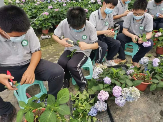 这次的劳动项目主要是绣球花的扦插。黄云老师给同学们分好小组,两人一组。每组领好一盆绣球花、两把剪刀和一个方形塑料盘。技术员夏老师介绍了绣球花的特点以及花卉扦插的知识和要领:“绣球花为虎耳草科绣球属植物,花型丰满,大而美丽,其花色能红能蓝,赏心悦目,是常见的盆栽观赏花木。有的花卉用种子繁殖,而绣球花则可以用枝条扦插繁殖。今天,我们使用的工具是比较特殊的剪刀,注意使用时的安全;剪刀使用前要先在高锰酸钾溶液中浸泡消毒。我们先剪取10厘米左右的一段枝条,每个枝条上要留有两片叶子和两个嫩芽,叶子剪掉一半……”同学们认真地聆听着。