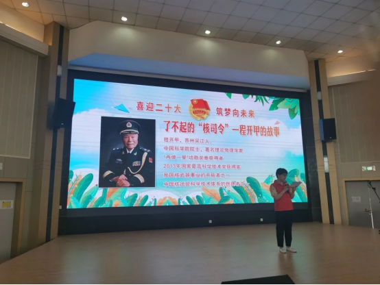 随后,平望镇基层理论宣讲团成员唐静波以《了不起的“核司令”——程开甲的故事》为题,为同学们带来了一堂精彩的思政课。
