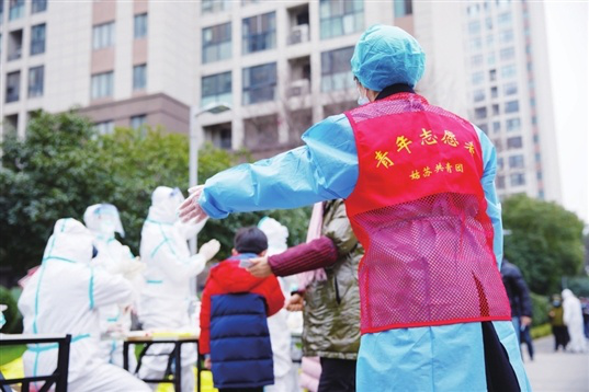 牛角浜核酸检测点位于观前核心区域,这里的人员情况很复杂,既有本地居民,又有观前大大小小各类商户的经营者,还有80多家宾馆、酒店入住的游客,核酸采样的任务极其繁重。在快速熟悉流程后,金矫赵齐的点位,从清点和备齐抗疫物资、搭建采样帐篷,到辅助核酸检测、安排志愿者工作,全都进行得有条不紊。面对同事们的赞扬,这个“00后”男孩腼腆地说:“我年轻,能做一些力所能及的事情,就不应该退缩。”
