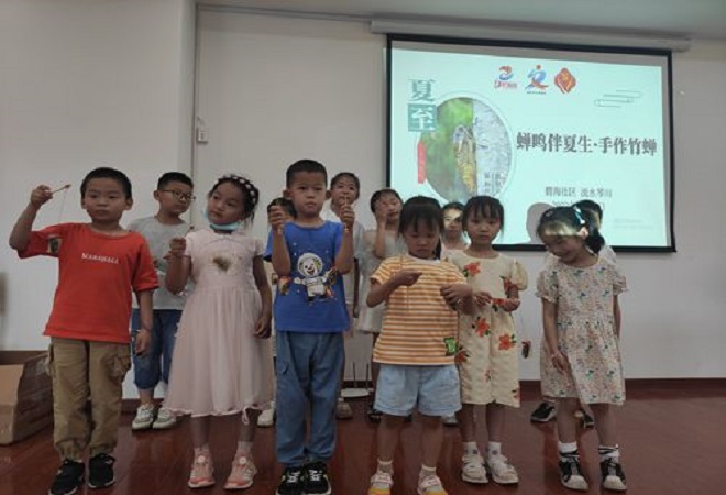 蝉鸣伴夏生,蝉声是这个时节里的最热闹的声音,接下来,小朋友们在工作人员的带领下,和家长一起做了一只会叫的竹蝉,亲身感受通过振动鼓膜发出声音的科学原理。