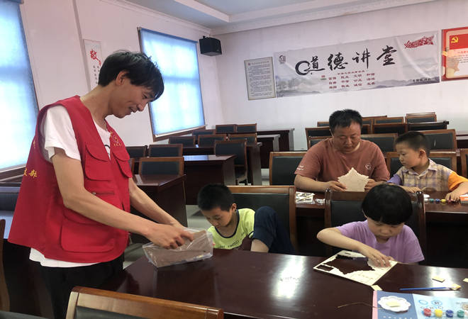 活动开始前,团员向孩子们介绍了中国共产党的相关知识,带着对党的感动和敬意,团员们带领孩子一起开始制作“星星向党”手工作品。在团员的帮助下,孩子们将红色的地图、黄色的党徽拼装在一起,同时为每一个部件精心绘制了绚丽的色彩。