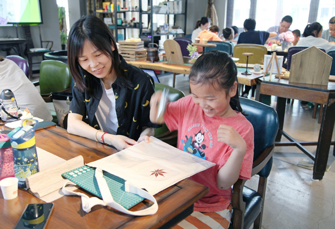 活动伊始,工作人员向大家介绍植物拓印的基本知识,所谓植物拓印,就是通过敲击,将新鲜植物叶片的汁水印在布袋上,形成独特的叶片图案。活动现场工作人员还给各组家庭准备形状各异的树叶花朵,现场演示植物拓印操作,大家都按捺不住动手创作。现场,小朋友们在家长的协助下,拿着小铁锤用力敲打摆好植物的环保袋,现场敲打声此起彼伏,十分热闹。不一会儿,在孩子们灵巧的小手下,一个又一个充满创意、色彩斑斓的拓印环保袋便呈现在眼前。