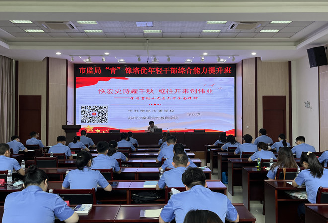 开班仪式上,局党委书记、局长潘健作开班动员,对年轻干部提出三点要求:一是要把市场监管事业作为人生的宣言书,志存高远,担当时代责任。二是要把市场监管事业作为人生的磨刀石,脚踏实地,锤炼过硬本领。三是要把市场监管事业作为人生的引航灯,崇德修身,做到一身正气。开班仪式结束后,中共常熟市委党校副校长陈云水以《恢弘史诗耀千秋 寄往开来创伟业》为主题,为培训班学员传达党的十九届六中全会精神。