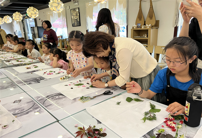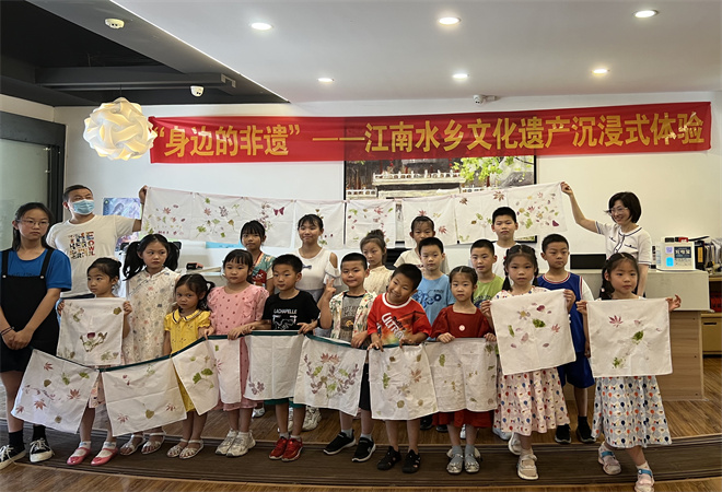 古镇、名宅、古戏台、土布工艺、苏绣、摇快船、竹编、阿婆茶、水乡婚俗、十二坊、挑花蓝、沈万三食品加工制作技艺在内的数十种非物质文化遗产就在我们身边。活动现场,青年志愿者详细地介绍了项目内容,并和孩子进行游戏互动,在老师的讲解和指导下,孩子们还体验了非遗手作:拓染(植物敲拓染)——让植物封印在织布上。通过非遗知识的学习和手工体验,让水乡的孩子们充分感受到了传统非物质文化遗产的独特魅力。