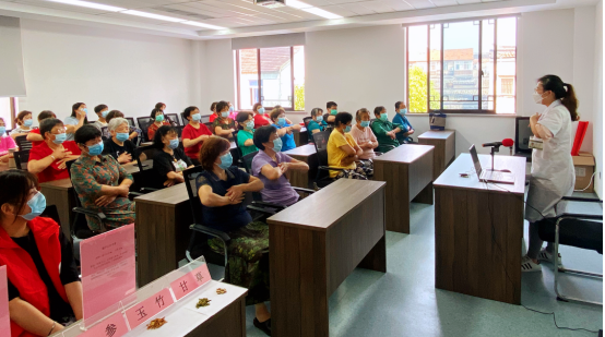 活动伊始,志愿者用他们的热情和专业为居民奉上了一堂药膳文化科普课,课程从百姓关心的夏季养生、慢性病防治等角度出发,详细阐述了食疗药膳的具体方法、注意事项。课上,居民们聚精会神,兴趣盎然,在中医师示范下跟着学起了养心保健操。