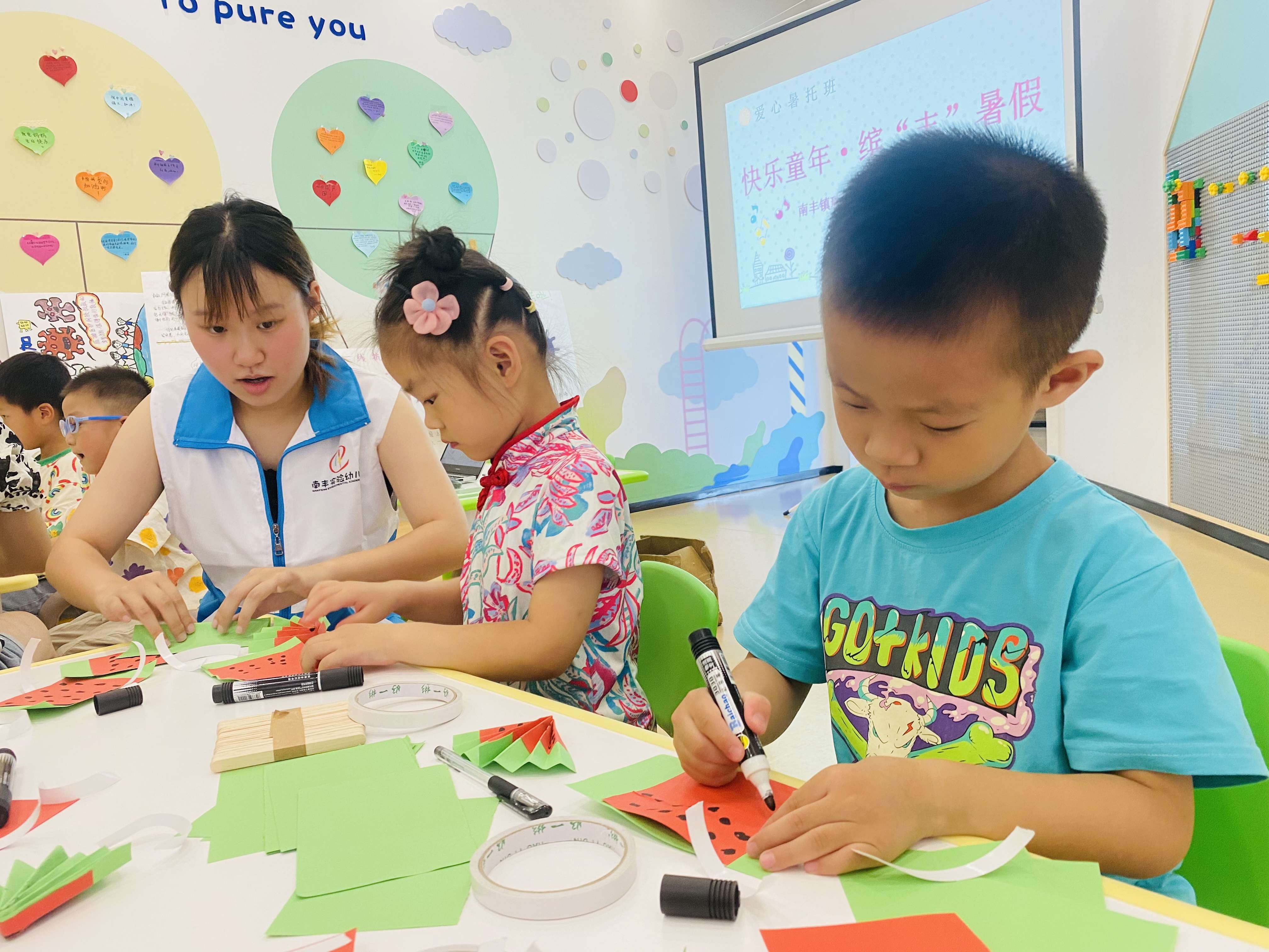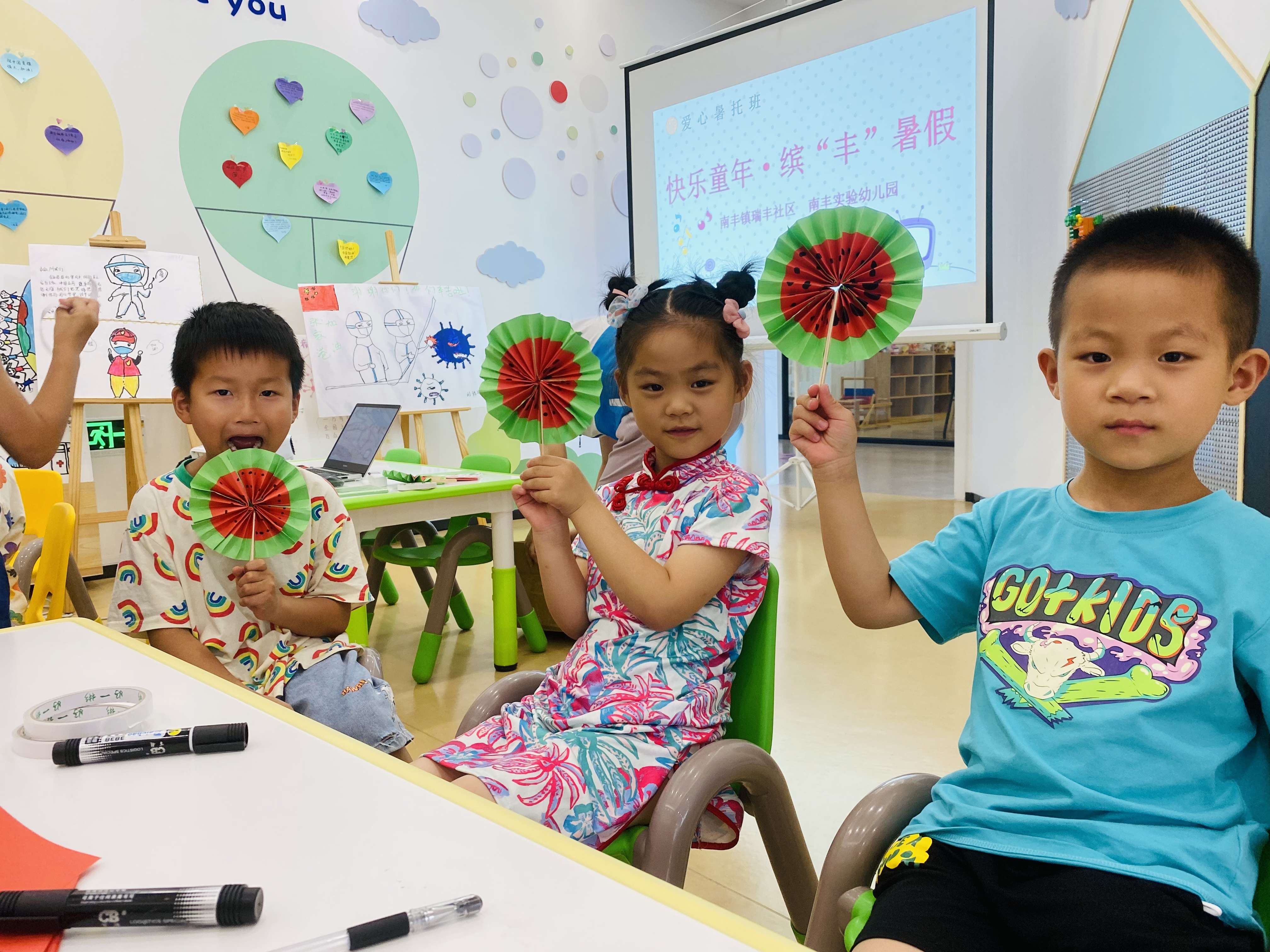 夏日炎炎,热浪滚滚而来,浴室成为每日冲刷腾腾热气的场所,看似安全的浴室,其实也存在着很多的安全隐患。通过开展《浴室里的陷阱》安全教育活动,依托课件展示以及生活经验,工作人员引导青少年列出浴室内可能存在的安全隐患,针对这些隐患,鼓励大家分组讨论,分享交流避免这些隐患发生的小技巧。随后,少年们制作了夏日消暑神器——西瓜扇子。“小扇子,小扇子,像大手,大手招一招,汗珠跟它走”,手工活动在充满童趣的夏日儿歌中拉开序幕。工作人员引导青少年观察、分析、交流西瓜扇子的特点,从而掌握制作技巧。制作过程中,青少年们互帮互助,在忙碌的身影中,一个个可爱精致的西瓜扇子完工了,拿着自己的劳动成果,稚嫩的脸庞露出纯情的笑容。