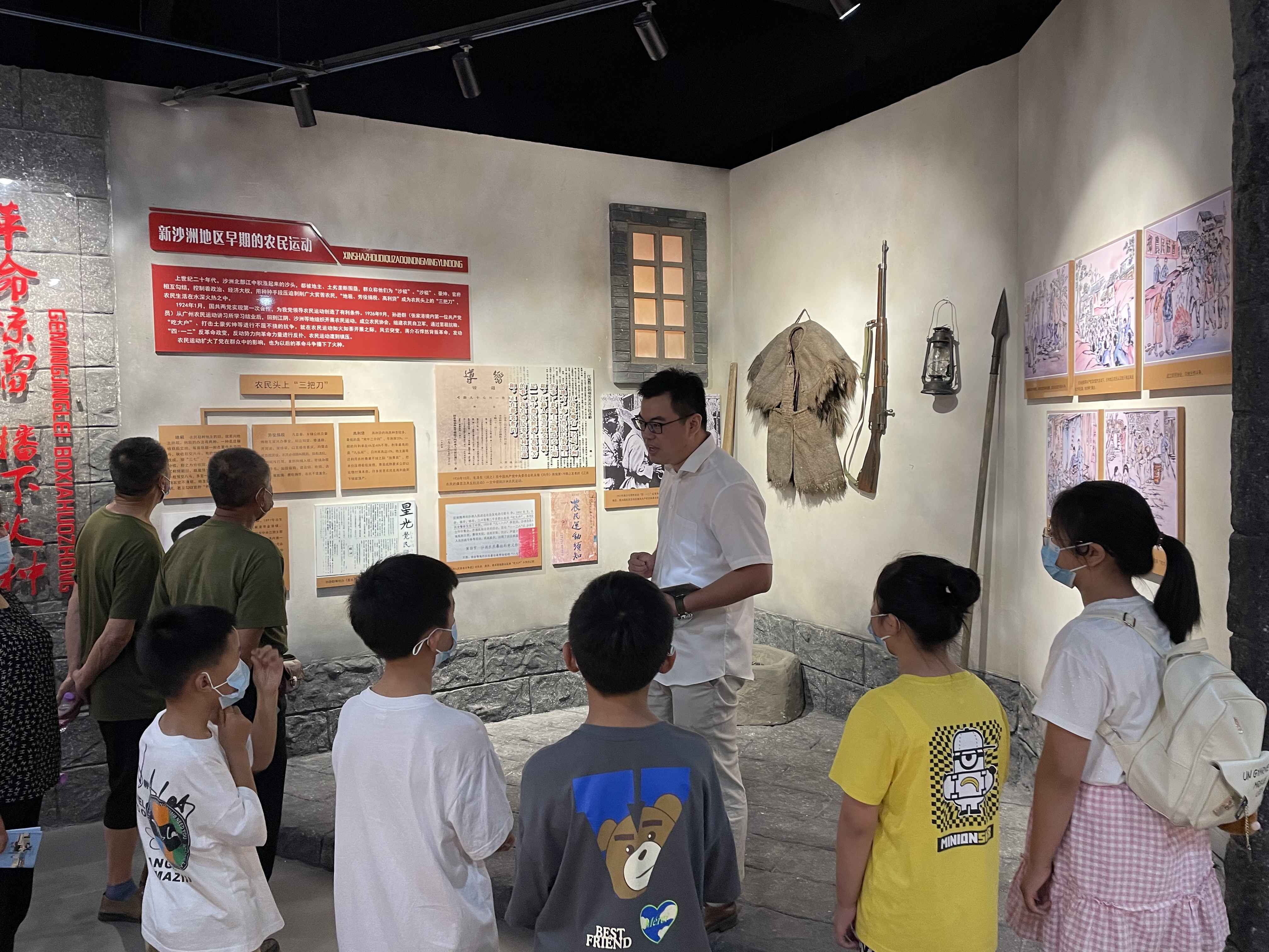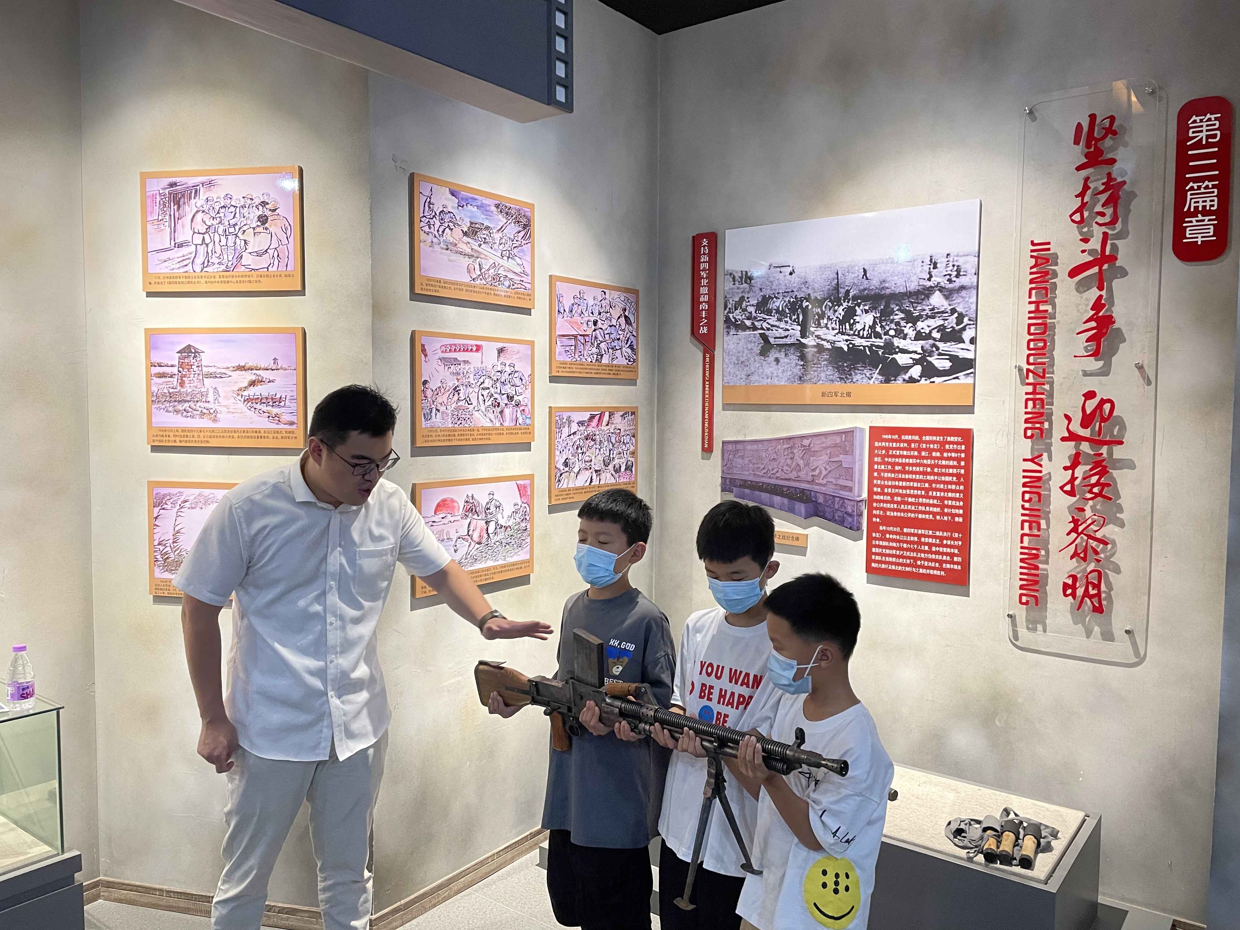 红色新沙洲党史教育展览馆主展区共分“革命惊雷 播下火种”、“抗战铁流 驰骋南北”、“坚持斗争 迎接黎明”、“红色记忆 燃情岁月”、“丰碑永存 光照大地”5大篇章,一进党史馆,青少年就被红色的氛围深深吸引,讲解员声情并茂地介绍了展馆内文字、照片、影像、实物等,退伍老兵、青少年们仿佛置身历史主战场,亲身经历沙洲儿女不畏牺牲、英勇抗击敌寇的事迹。