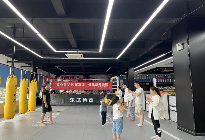 7月2日上午,搏击培训课程在乐武艺体培训中心顺利开班,来自龙潭社区辖区内的10组亲子家庭热情参与到搏击课学习,本次搏击培训课程从今起到7月底,共持续四周,每周一节课。乐武中心张教练介绍,此次搏击课培训课程主要教授小朋友搏击训练的基本动作,分别从侧面站姿、小跳、直拳、勾拳、摆拳、顶膝、侧踢等几个动作,激发小朋友们对搏击课的学习兴趣。除了教授孩子们搏击常识,在亲子游戏环节,家长们将参与进来,与孩子们磨合、协调、互助,在互动游戏中学习搏击技巧,让孩子学会简单的自我防护,也为家长和孩子提供特别的亲子时光。