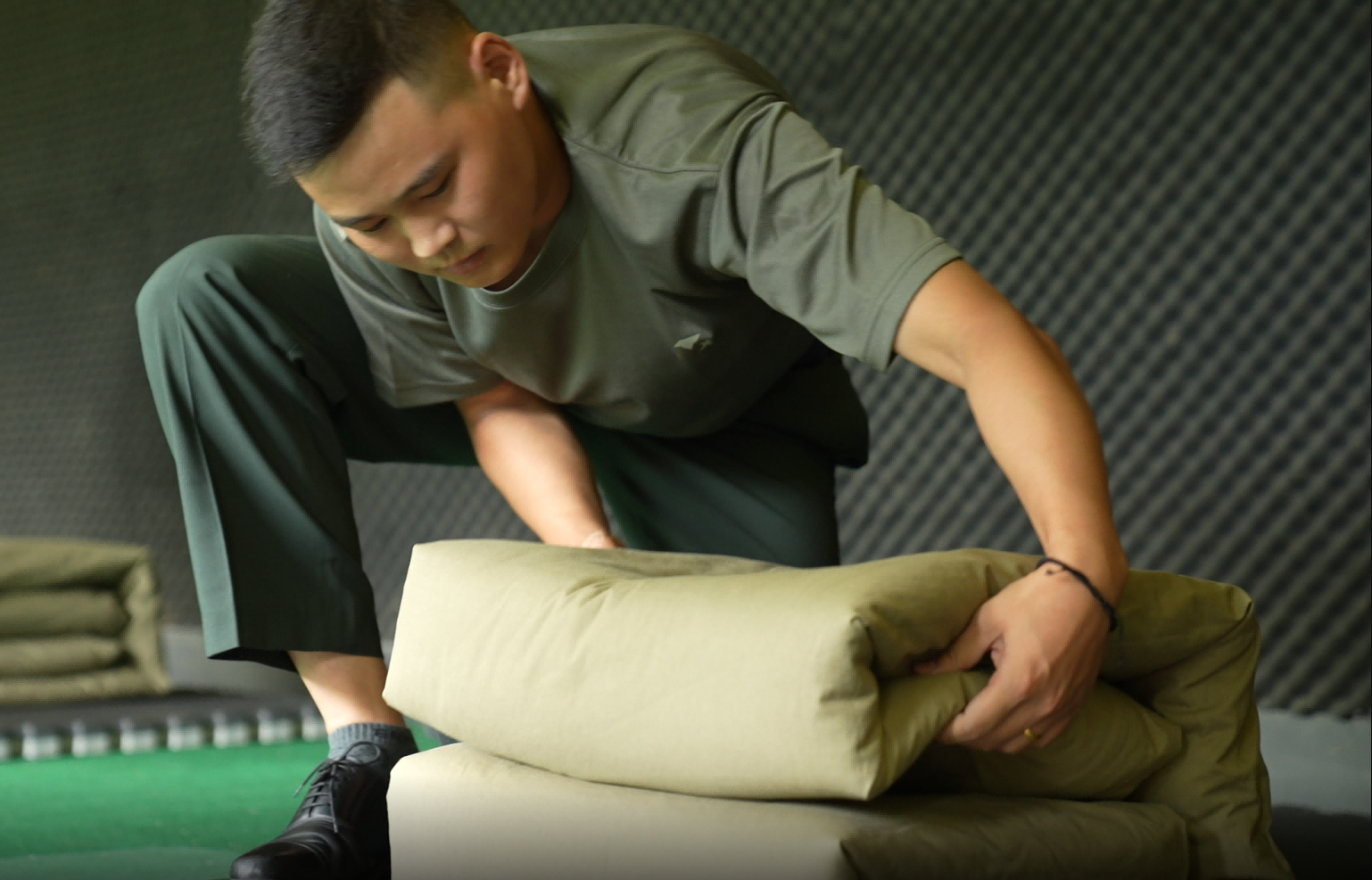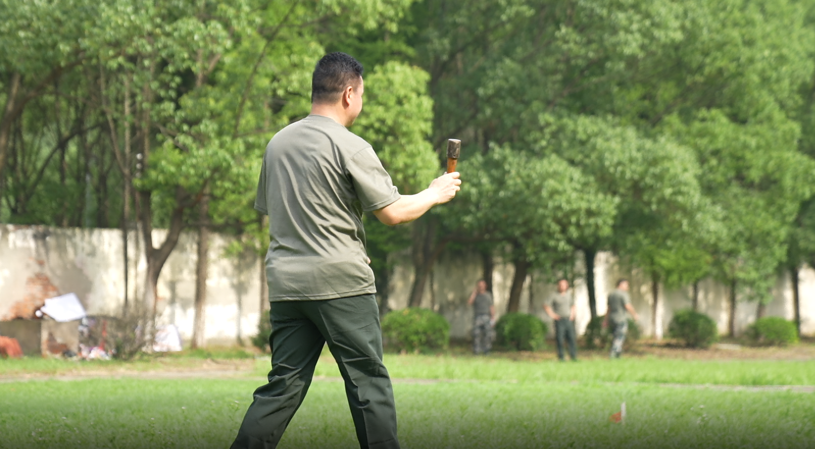 稍息、立正、报数、齐步走……烈日炎炎下,10余名青年退役军人在操场列队训练,他们每个人都以饱满的精神全身心投入训练。虽然没有了领花、胸标、臂章,但他们仍以挺拔的身姿、有力的步伐、整齐的队列,听从指令,一丝不苟做好每一个动作。在“叠军被”比赛中,选手们争分夺秒,耐心细致得做好叠军被的每一步,在规定时限内完成了比赛内容。虽然他们已告别军队多年,但军人风采不减当年。投弹“比武”现场,3人为一组,每人投掷3枚,3次累积成绩作为最后得分。每当有人发挥不理想,后面出场的同伴都卯足了劲儿,想要“超水平发挥”把全队的总分拉上去,每当有人投出好成绩,现场一阵欢呼。
