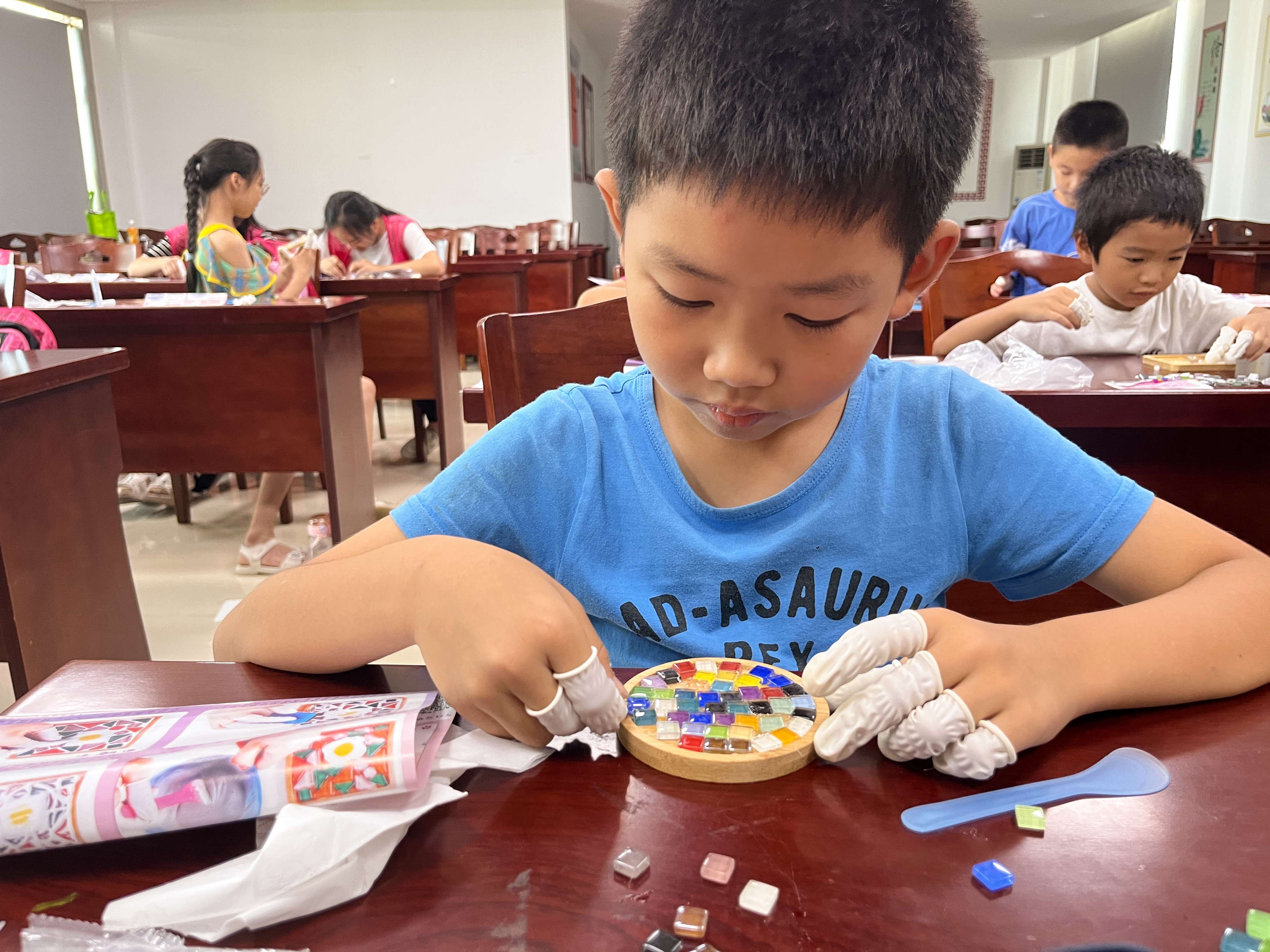 首先,工作人员先为孩子们讲解了垃圾分类的意义,让大家了解如何对垃圾进行分类处理,并通过知识问答的方式,让大家熟悉垃圾分类的方式。随后,进入制作马赛克杯垫的环节。志愿者简单介绍了用于做马赛克杯垫的各种材料,接着就耐心地为大家讲解DIY步骤。孩子们专心致志地聆听完工作人员的讲解后,就开始和周围的小伙伴们积极讨论自己的想法,接着把琳琅满目的马赛克小砖分门别类,迫不及待地将小脑袋里的奇思妙想变成一个个可爱的小杯垫。这看似简单的拼贴,但操作起来却一点也不简单,想要把这一颗颗又小又不规则的马赛克完美地镶嵌在一起,需要非常的仔细和十足的耐心。手工期间,孩子们时不时地寻找工作人员的帮助,用稚嫩的声音询问工作人员制作杯垫的技巧与建议,使自己的作品独出心裁,更加与众不同。
