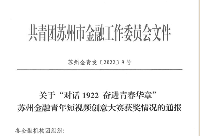 为学习贯彻和迎接党的二十大,结合庆祝中国共产主义青年团成立100周年,今年3月-6月,苏州金融团工委开展了“对话1922奋进青春华章”苏州金融青年短视频征集展播活动,要求各金融机构团组织围绕“我讲百年历史”、“我学青春榜样”、“我在岗位建功”主题编创短视频,引导苏州金融系统广大团员青年感悟历史、坚定信仰,高举团旗跟党走,建功立业书华章。