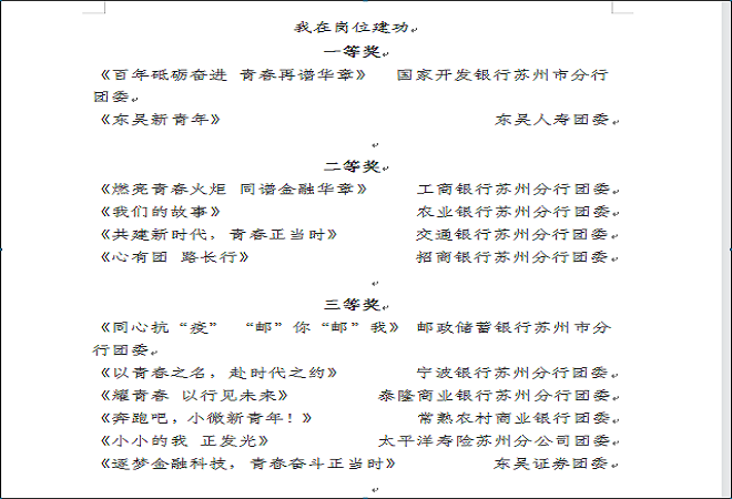 经过苏州金融团工委初评、线上展播、专家评审等环节,《东吴新青年》在参与比赛的36家银行保险机构选送的54个短视频作品中,荣获“我在岗位建功”主题一等奖。