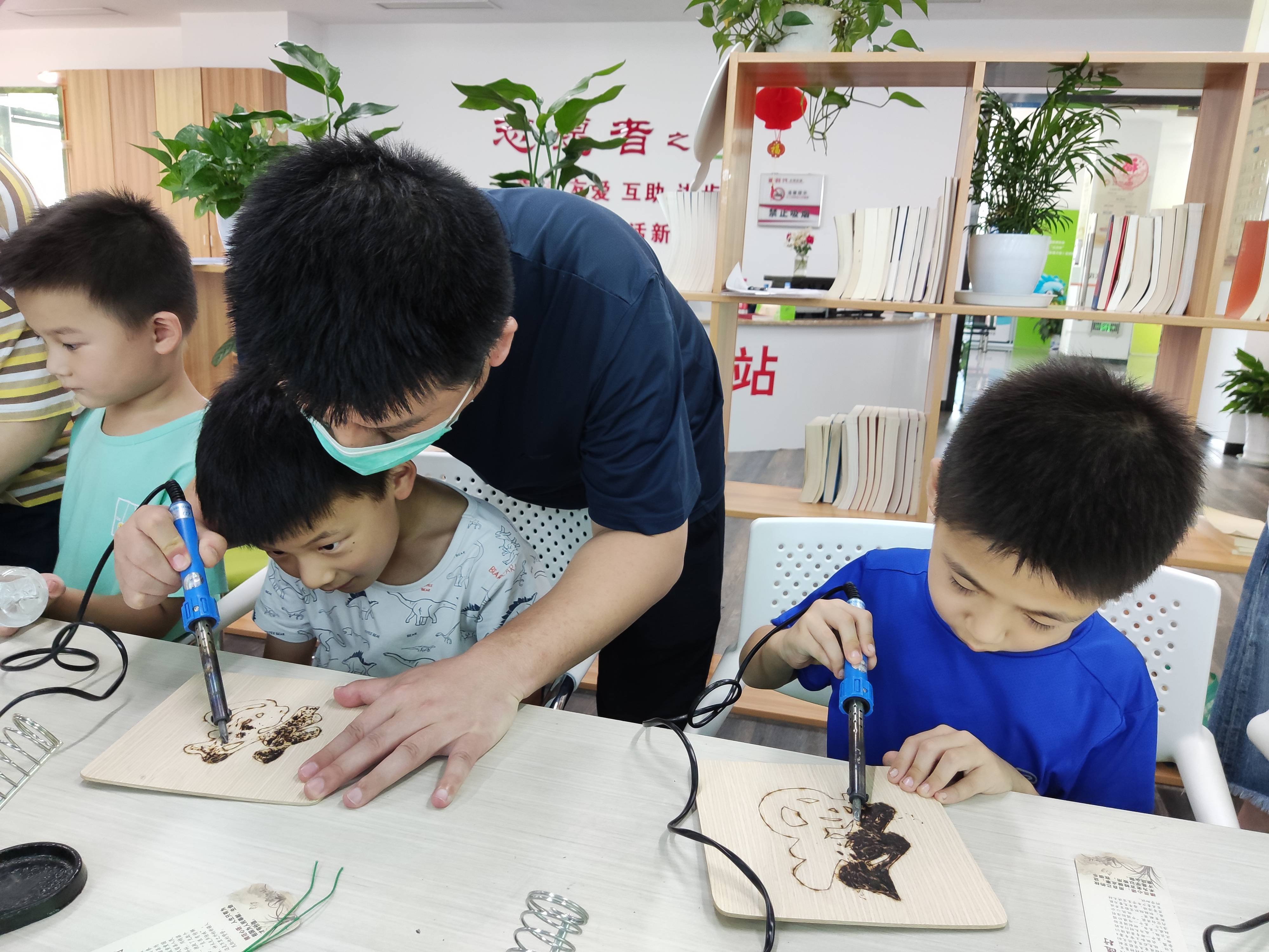 活动分为两个流程,第一个环节,邀请张家港市“非遗”传承人陈友忠授课,陈老师首先给大家简单介绍非遗文化——河阳烙画,并且为大家现场讲解河阳烙画的历史以及制作方法,孩子们纷纷拿起烙笔,活动现场一片欢声笑语,孩子们对于河阳烙画表现出浓厚的兴趣,一块木板,一只电烙铁,一双巧手,不一会儿大家的作品就跃然纸上了。