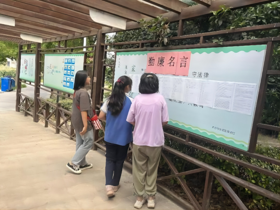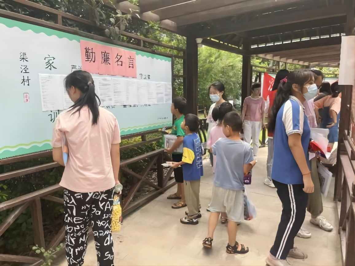 青年志愿者在渠泾村文化走廊张贴了关于勤廉的名言警句,带领渠泾村青少年们一起进行阅读并讲解。“慎言慎行一身正气 清正廉洁两袖清风。”“肩扛红盾,为人民服务,自警自励。”学生们朗朗的阅读声音在长廊响起。
