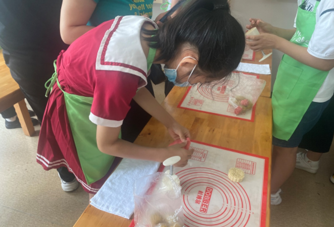 活动中,月饼师傅将防护垫、月饼模具、月饼皮、馅料准备就绪,接着向大家讲述月饼的制作流程:揉面团、包馅、放模具内按压成形。现场氛围浓厚、热闹非凡,看到一个个漂亮的月饼在自己的手中诞生,青少年们纷纷点赞。