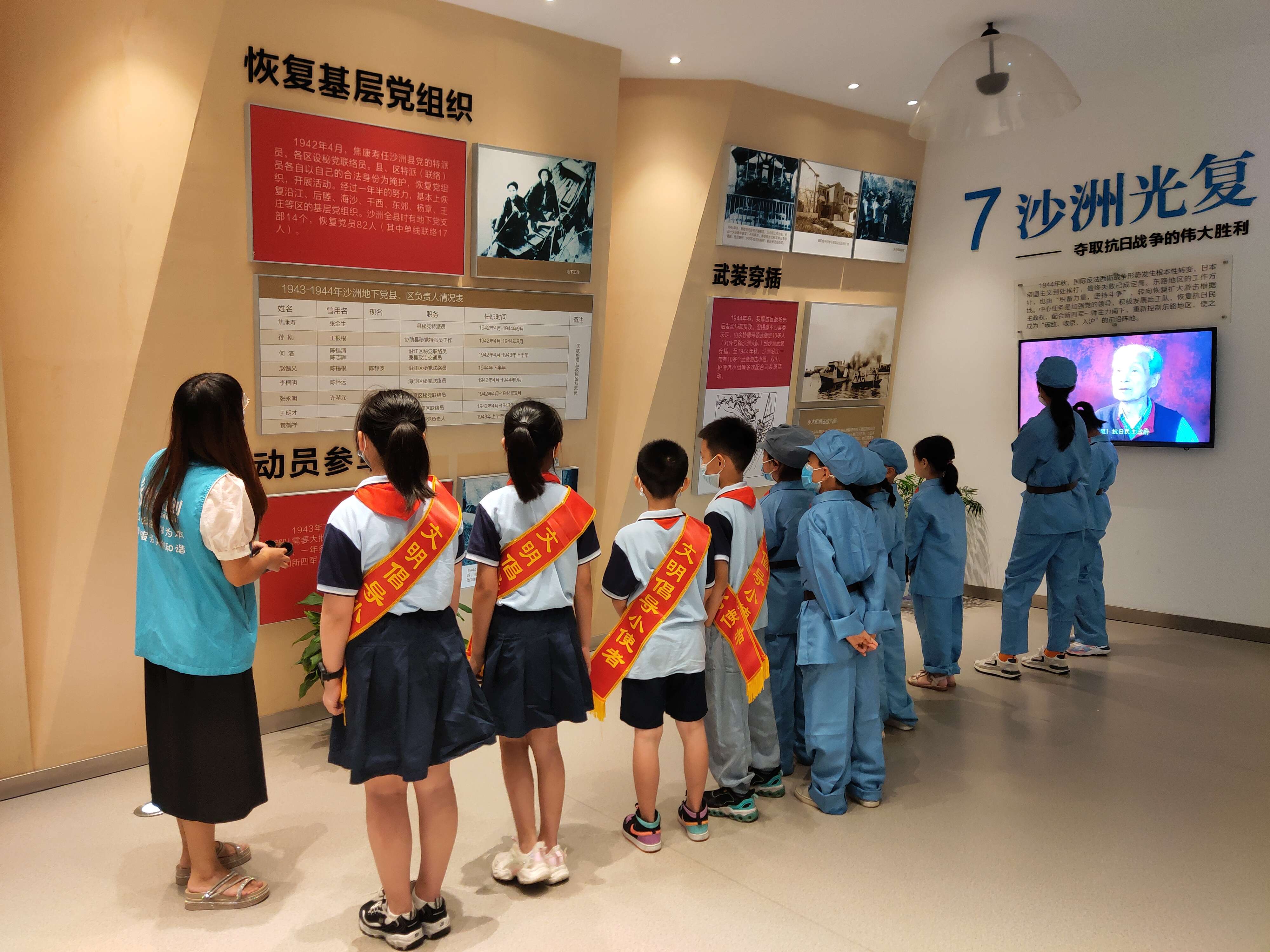 活动当天,细雨蒙蒙,家长和青少年团员们都冒雨准时赶到纪念馆,大家都很激动。沙洲县抗日民主政府纪念馆以沙洲儿女抗日斗争史实为线索,分“中华怒吼”、“国耻家恨”、“‘江抗’东进”、“众志成城”、“浴血奋战”、“百折不挠”、“沙洲光复”和“名录”八个部分。这些珍贵的历史文献资料及生动的影像实物材料,形象地再现了沙洲军民反侵略、求解放的斗争历程。在志愿者讲解员的讲解下,青少年团员们身穿小军服,沿着展厅,紧跟讲解员的步伐,仔细聆听讲解,回顾那段光辉历史和英雄壮举。看着纪念馆里的老式步枪、指挥刀、防毒面具、水壶等,想象着当时抗日的场景,大家仿佛穿越回了多年前峥嵘激荡的岁月。