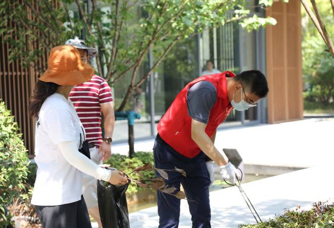 烈日炙烤大地,汗水展现担当。活动现场,志愿者们身着红马甲,手持捡拾钳、垃圾袋、扫把等工具,捡拾小区绿化带等公共区域的垃圾,烟头,果皮碎屑,统统逃不过“红马甲”们细致的眼睛。