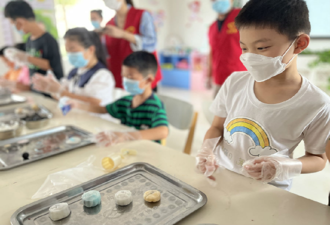 接着志愿者向大家简单介绍了月饼的起源、种类和特点,并示范了冰皮月饼制作的方法,随后给大家分发一次性手套。戴好手套后,冰皮与馅料也挨个发到了青少年的手里,根据志愿者的讲解和指导,青少年们都迫不及待地动手制作起来啦!浩瀚的星空中,繁星点点,嫦娥端着美味的月饼等待着家人归来。随着时间一点点流逝,一个个精美的月饼呈现在大家面前,青少年开心地展示着自己的作品,并表示要把作品送给自己最爱的人。