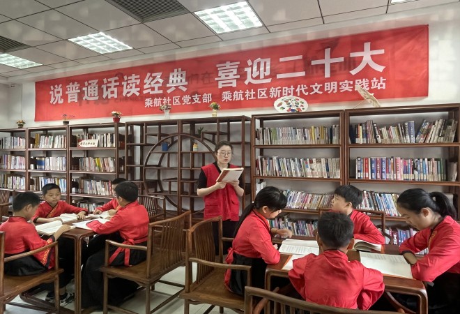 “学而时习之,不亦说乎?有朋自远方来,不亦乐乎?人不知而不愠,不亦君子乎……”“我们的祖国真大,北方有冬爷爷的家。十月就飘大雪花。我们的祖国真大,南有春姑娘的家。一年四季盛开鲜花……”在乘航社区阅览室,青少年们身着传统服饰,精神饱满,在乘航小学党员教师志愿者张鹰的带领下,兴致勃勃地跟随节奏齐声诵读《论语》、儿童诗歌《我们的祖国真大》等,标准的发音、抑扬顿挫的节奏,时而铿锵有力,时而悠远绵长,时而动人心弦,让青少年们享受了一场精彩的文化盛宴,也真挚地诠释着对党对祖国的深深热爱。