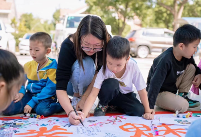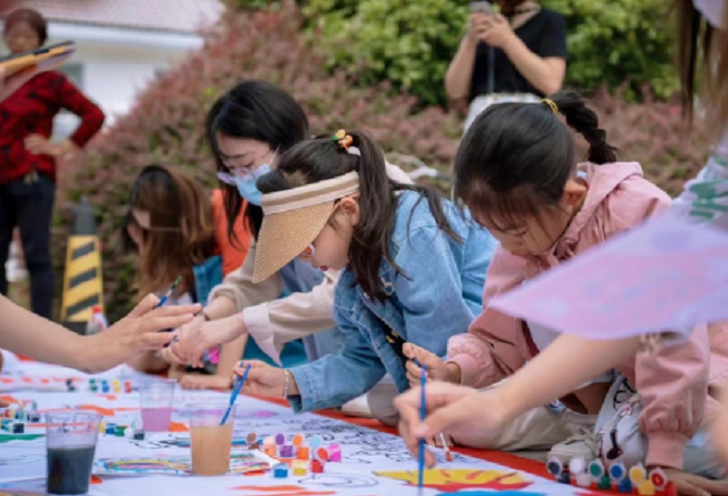 在活动现场,一条长卷旁,青少年们投入到忘我的创作中,有的甚至直接趴在画布上尽情涂抹挥洒,用一根根画笔描绘着他们对祖国的祝福和热爱;青年妈妈们则在旁边给孩子们的画作进行图案、选色、上色指导,并鼓励孩子们充分发挥自己的想象力自由绘画。
