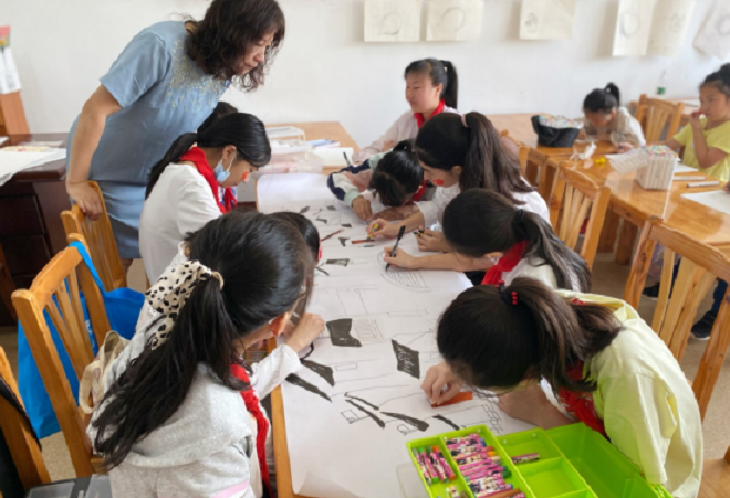 活动由王靖艳老师指导,将现场青少年按照年龄分为两组,高年级组绘国庆长卷、低年级组进行个人国庆绘画。现场青少年发挥自己想象力,为画作设计图案、描画边、涂点缀,孩子们在王老师的指导下手执画笔,彩绘心声,在画纸上用心创作。飘扬的五星红旗、宏伟庄严的天安门,画纸上一幅幅图案,将自己对祖国的美好祝福生动展现出来,绚丽的画卷也承载着孩子们对祖国和家乡的热爱。
