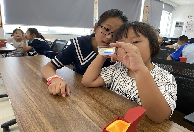 活动开始,工作人员向青少年讲解了三棱镜的原理:因为光具有波动性,不同颜色的光的频率不同,进而导致它的折射角不同,而太阳光是七种颜色的光混合成,经过三棱镜后,不同颜色的光就被分开了,也就形成了彩虹。随后,少年们组成实践小分队进行实验操作,少年们选择一张白纸小心翼翼的铺在地上,然后让阳光从三棱镜的一个侧面射入三棱镜,保持入射角在45°左右。少年们围成一圈,紧张的看着纸面上的变化,期待着彩虹的出现。为了留下美丽的彩虹,志愿者指导青少年将形状各异的玻璃瓶填满七色的彩虹球,制作出形色各异的彩虹瓶。看着自己亲手制作的作品,少年们相互展示,享受着成功的喜悦。