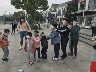 金秋送爽,丹桂飘香的十月,胥口镇20余组青年家庭齐聚胥江欢乐广场开始了欢快的亲子有氧行活动。活动开始,蜜糖家庭的张老师为活跃气氛,增加孩子们的熟悉度和参与度,组织了团队游戏“你是我的眼”,这个游戏5个孩子为一组搭肩前后排开,前面四个孩子眼睛蒙住,最后一个孩子是他们的眼睛,用拍左右肩膀来依次传递是否前行、左走还是右走,路面上依次设置了小礼物,通过考验团队的默契与合作,来考察团队的协作能力。这个游戏紧凑、欢乐,孩子们在玩游戏的过程中不仅得到了小礼物,还明白了团队合作的重要性,他们纷纷表示这个游戏很好玩。