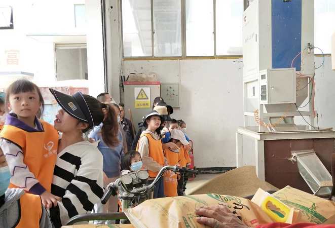 收割之后,工作人员将大家带到新米加工厂,孩子们围在新米加工厂周围,看着工作人员娴熟的动作,听着轰隆隆的机器声,不禁对工作人员表以崇高的敬佩之心, 也让孩子们切身感受“锄禾日当午,汗滴禾下土。谁知盘中餐,粒粒皆辛苦。”这一首《悯农》诗的深刻内涵。